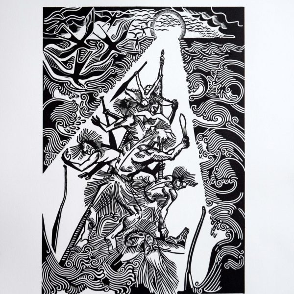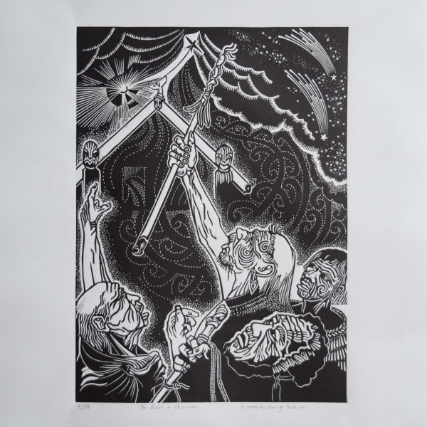Cliff’s most recent works are a series of lino carvings which explore his own experience diving and gathering seafood, and some larger panels illustrating incidents in the story of Hatupatu (an ancestor of the Maori Arawa tribe).