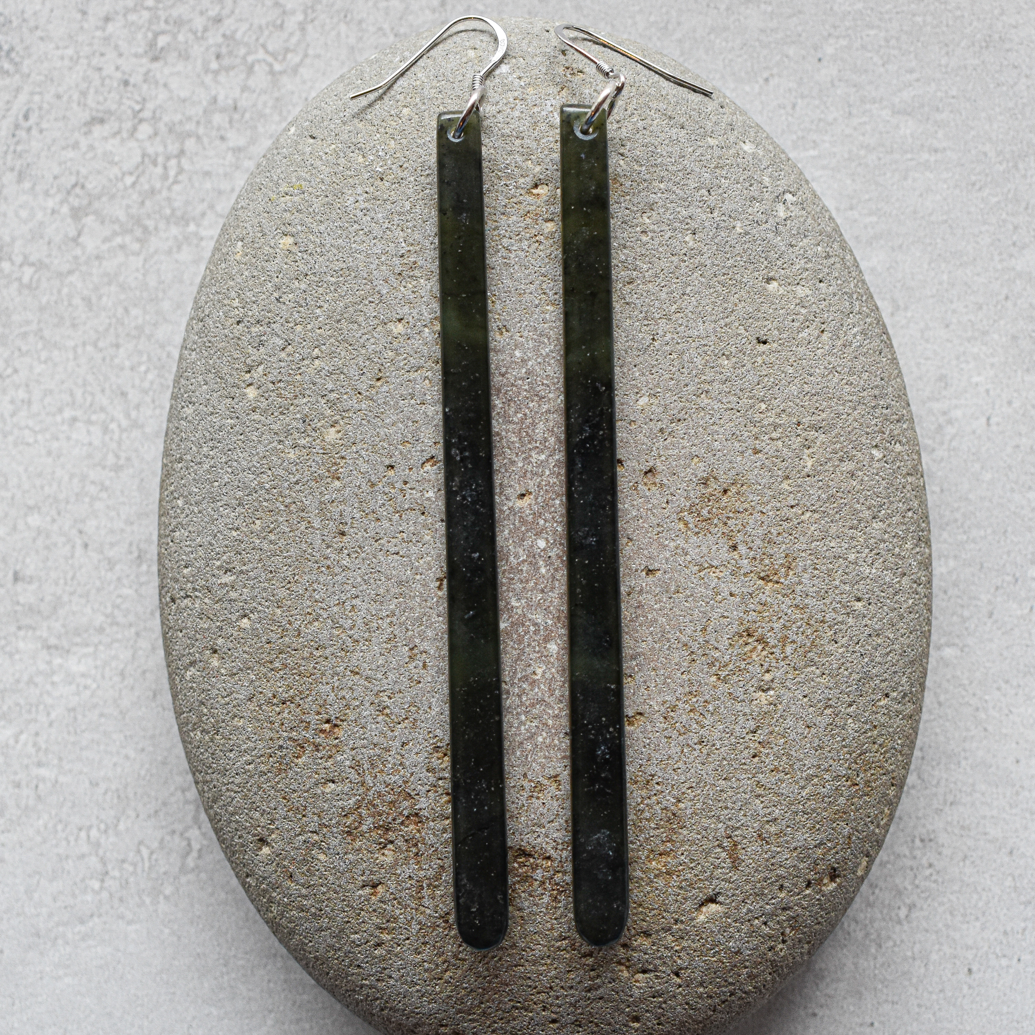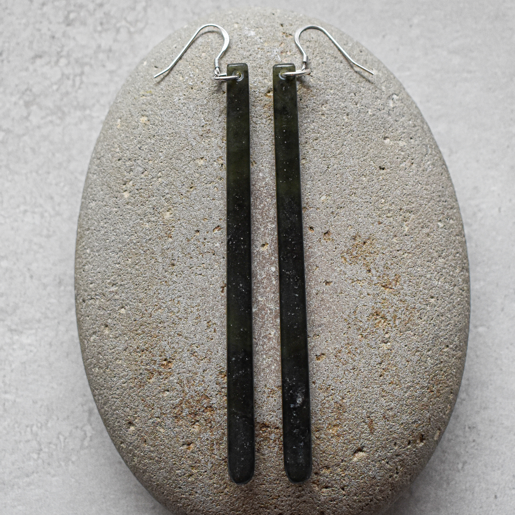 Alex Sands Greenstone Drop Earrings NZ greenstone/pounamu, silver 90 x 4 x 4mm As Oct25 #13-23