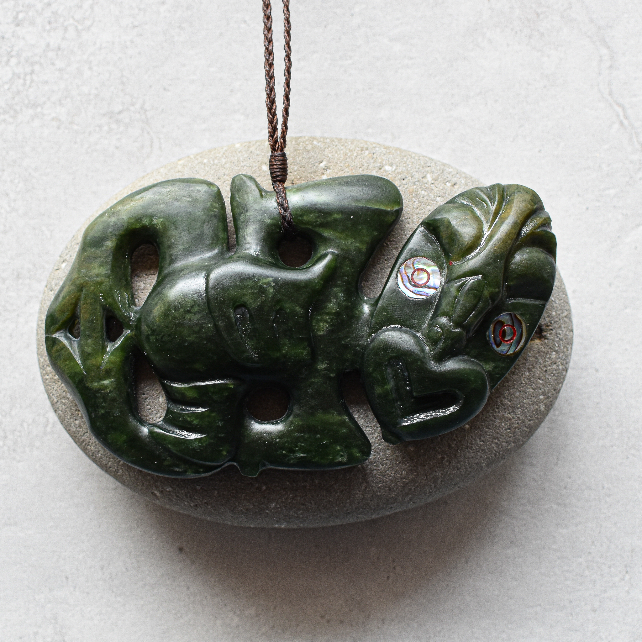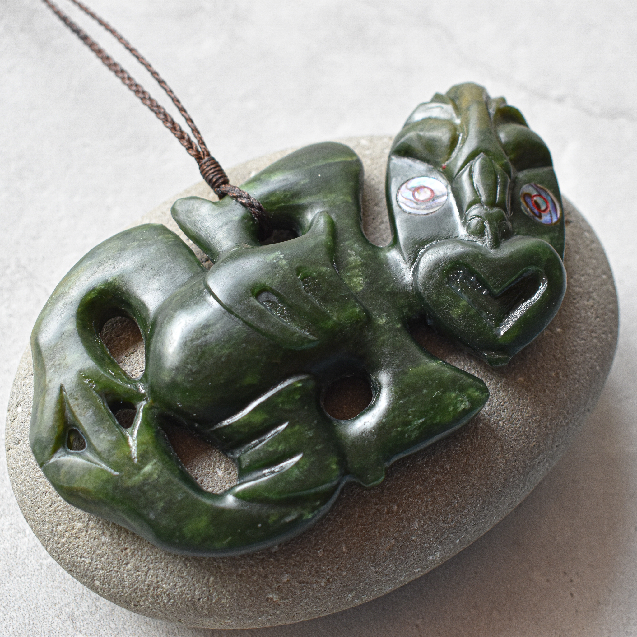 The tiki is a carved abstract human form usually made of greenstone/pounamu. The tiki is said to represent the first man or the first woman, and can be worn for good luck, protection from evil, and fertility.