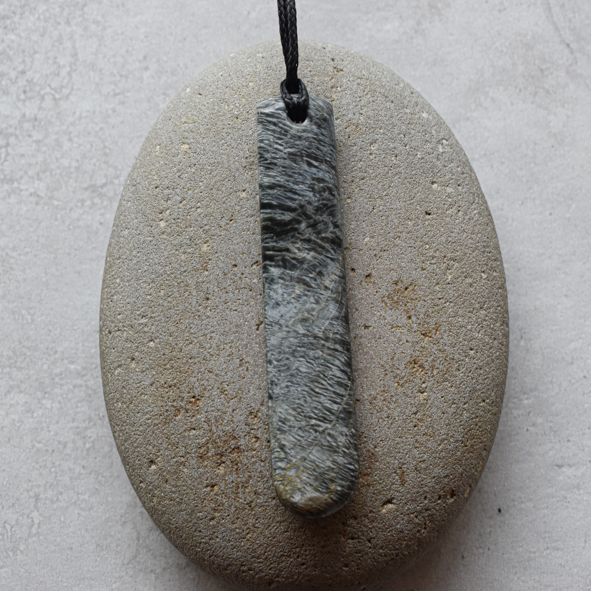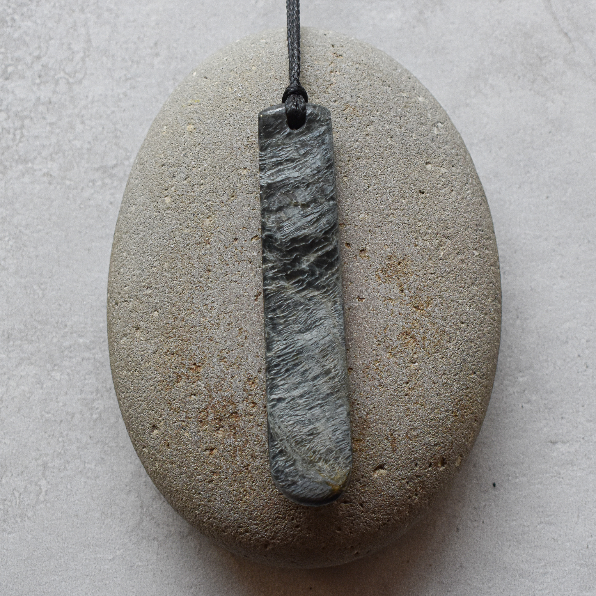 greenstone/pounamu (flower jade) , waxed cord, bone clasp