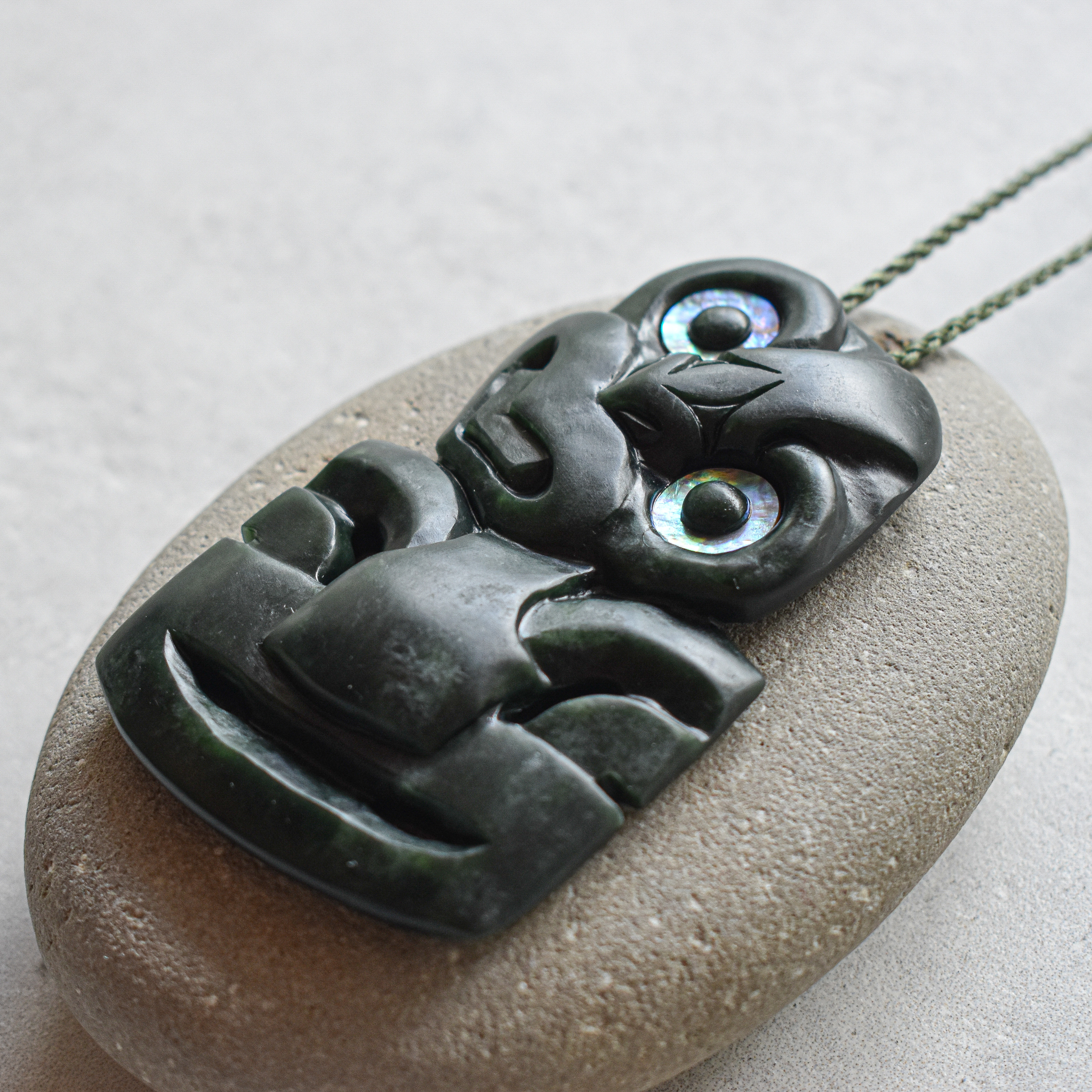 NZ Greenstone/Pounamu, Paua inlay, Waxed Green Cord