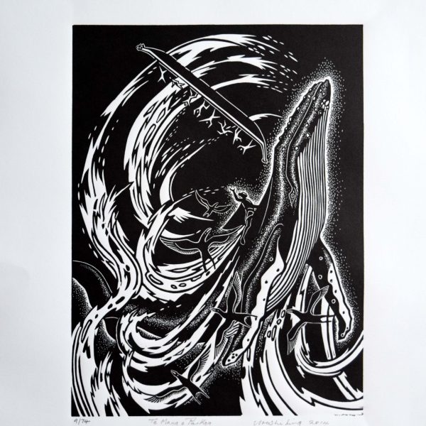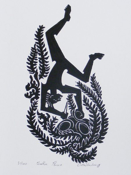 Cliff’s most recent works are a series of lino carvings which explore his own experience diving and gathering seafood, and some larger panels illustrating incidents in the story of Hatupatu (an ancestor of the Maori Arawa tribe).
