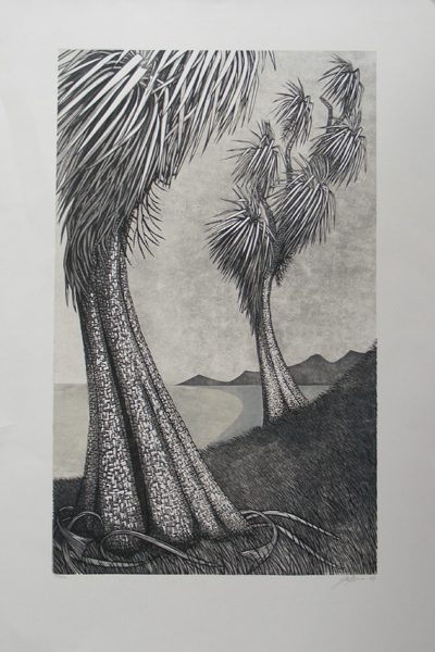 In 2001, Jono won Environment Canterbury’s “future environmentalist” of the year award and conservation still remains as one of his main passions. While still attending school, Jono was involved in research of the long tailed bat which are on the brink of extinction in the Hanging Rock area. This often involved counting and capturing the bats as they venture from the cavities of old cabbage trees. From these experiences, cabbage trees are well engrained in Jono’s mind and are the most popular subject in his art work.