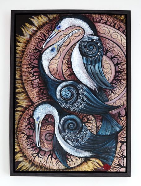 Slow’s art is steeped in Maori symbology and storytelling, often using birds as central figures. He sees interconnectedness as fundamental to Maori art and uses painting to interpret the world and his own unknown whakapapa (ancestry). He cites the Onetahua area and community elders, like Whero O Te Rangi Bailey, as significant influences.