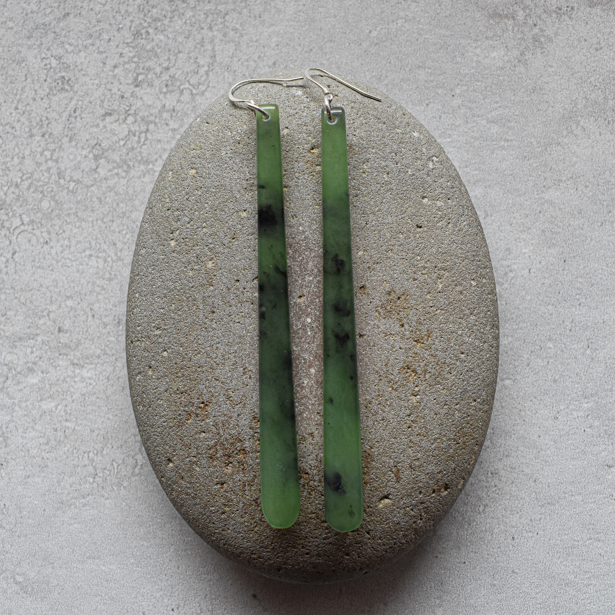 Alex Sands Greenstone Drop Earrings NZ greenstone/pounamu, silver 93 x 6 x 5mm As Oct25 #13-22