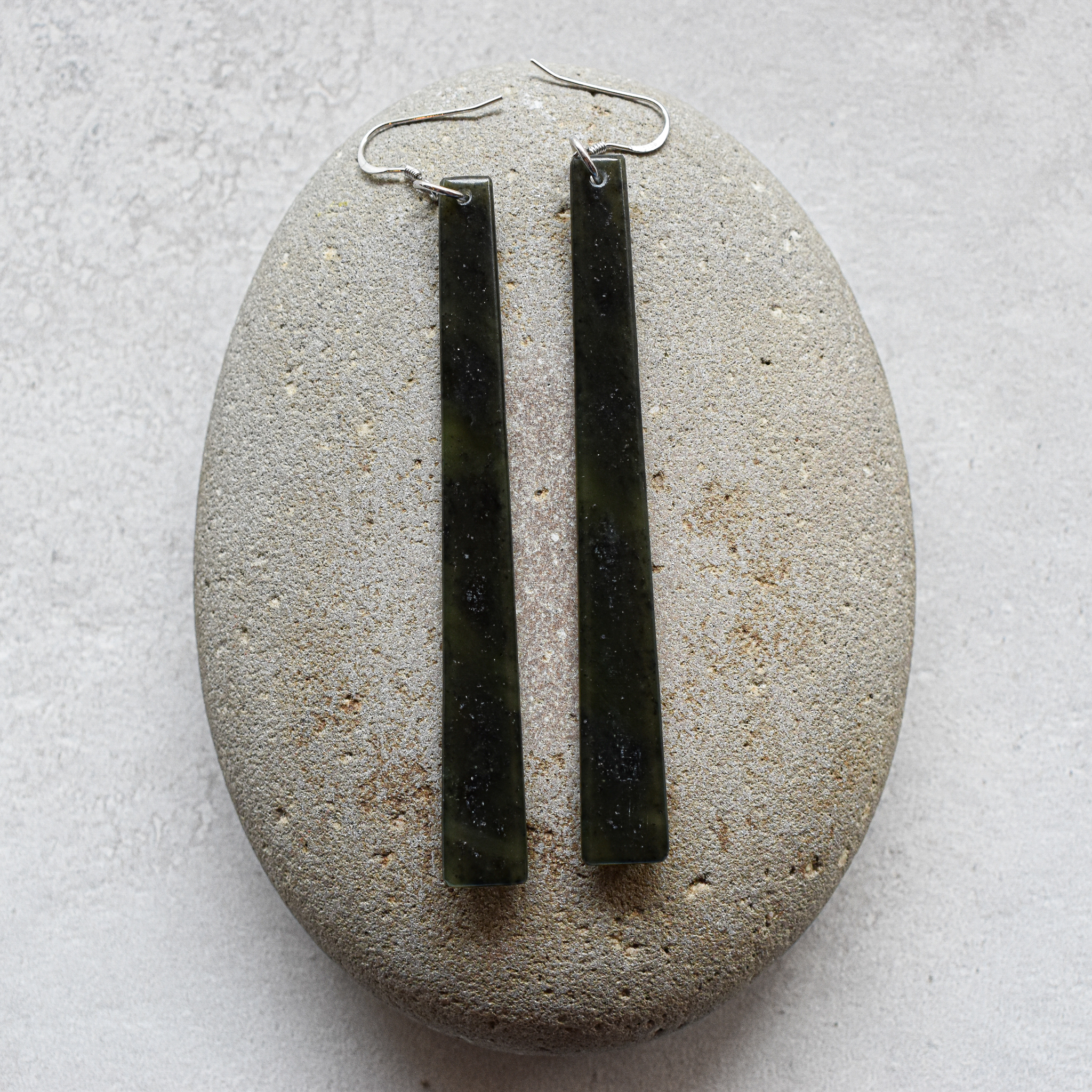 Alex Sands Greenstone Square Earrings NZ greenstone/pounamu, silver 82 x 10 x 3mm As Oct25 #13-21
