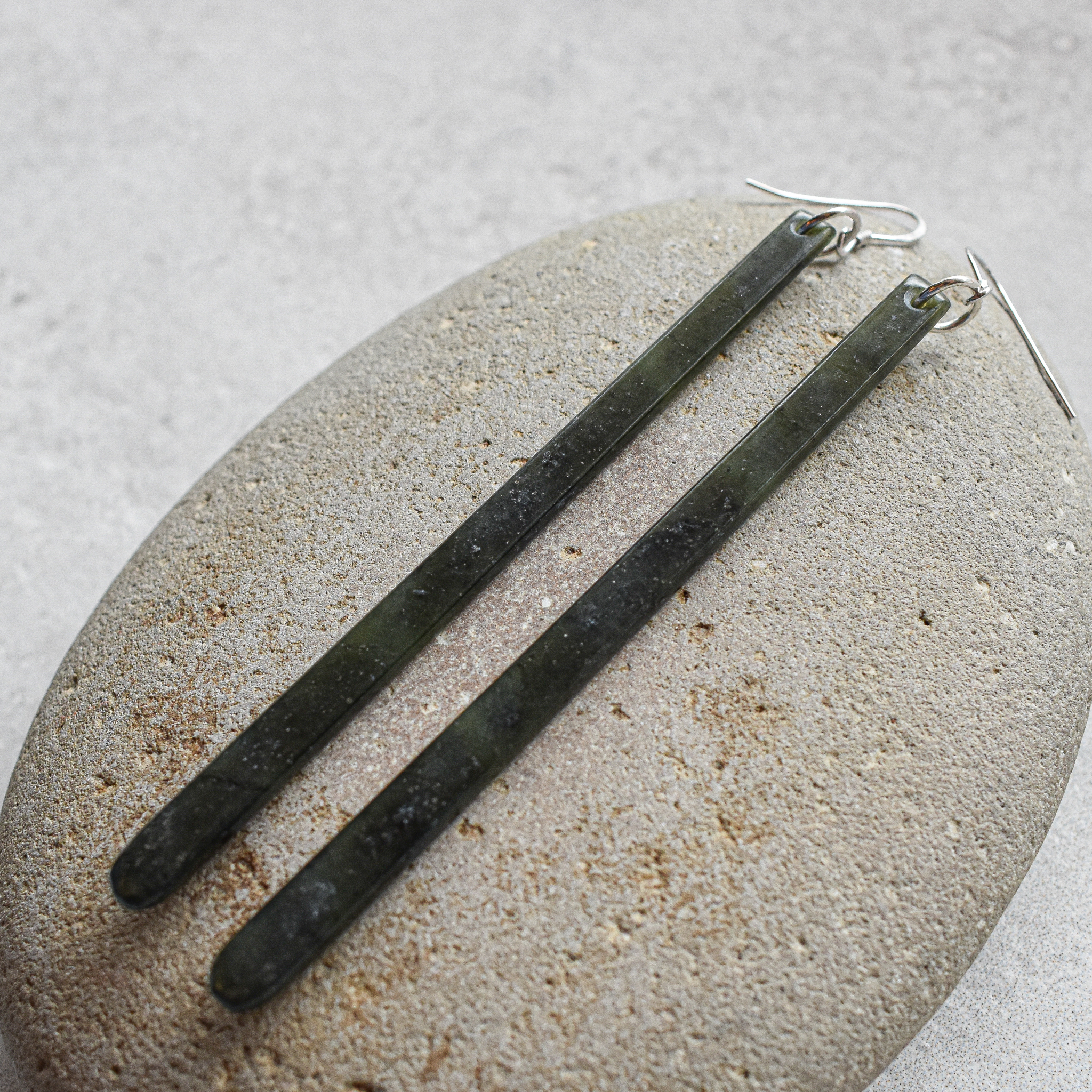 Alex Sands Greenstone Drop Earrings NZ greenstone/pounamu, silver 90 x 4 x 4mm As Oct25 #13-23